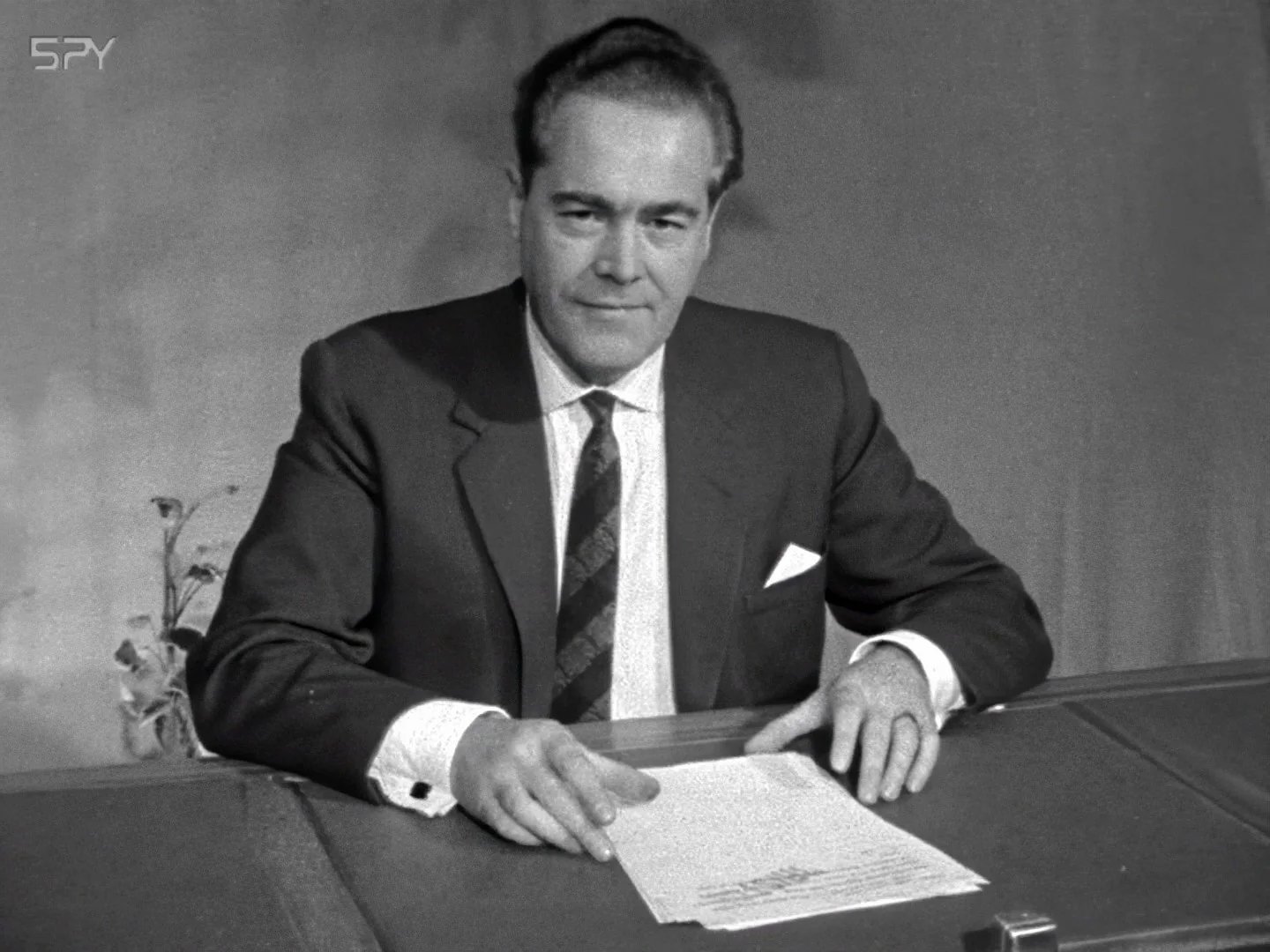 This first bulletin is lucky to have survived. The live broadcast was sent on a video link back up to London so a copy could be made, probably in order for managers to review the presentation. In those days before the advent of videotape the only medium for recording was film. A special machine was available at Alexandra Palace the home of BBC news. This synchronized an incoming video signal to a 16mm film camera. The recordings of early TV programmes (before the invention of videotape) could only be made using this 'telerecording' method. This BBC West film suffered badly from vinegar syndrome a chemical breakdown of the acetate film base - so called because of the pungent aroma given off by affected films. The telecine inserts from the broadcast were also badly rendered on the original film so have very low fidelity. This edit has been digitally processed to improve its stability, resolution and audio fidelity.